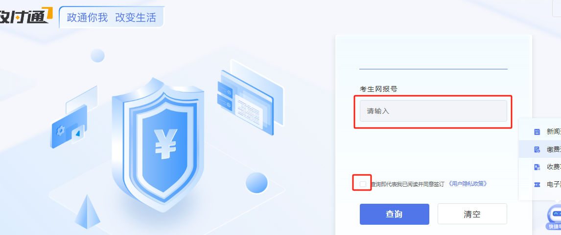 此地址跳转到缴款码查询页面,用来查询此次考试缴费对应的缴款码(标红处输入考生网报号,并勾选下方“同意签订《商户服务协议》”后点击查询即可,网报号在报名系统中打印的《报名申请表》左上角显示)。